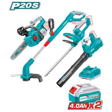 Combo formado por motosserra, cortador de bordas, corta-sebes e soprador a bateria, duas baterias e carregador. Motosserra brushless a bateria TGSLI20128. Cortador de bordas a bateria TGTLI20018. Corta-sebes a bateria THTLI20018. Soprador brushless a bateria TABLI20428. Duas baterias de 4Ah. Carregador TFCLI2001.
